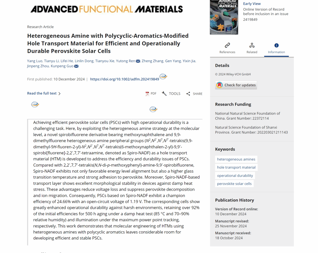 近日,我校新材料界面科学与工程教育部重点实验室有机光电课题组郭鹍鹏教授团队在提升空穴传输材料热应力稳定性和钙钛矿太阳能电池耐用性研究领域取得重要研究进展。研究成果以“Heterogeneous Amine with Polycyclic-Aromatics-Modified Hole Transport Material for Efficient and Operationally Durable Perovskite Solar Cells”为题,发表在国际顶级学术期刊《Advanced Functional Materials》(影响因子18.5)。该论文的第一署名单位为国产亚洲精品美女久久久_99久无码中文字幕一本久道_亚洲成AV人影院_亚洲AV影院一区二区三区 狠狠躁夜夜躁人人爽天天不卡_国产激情久久久久影院老熟女_精品性高朝久久久久久久,我校硕士研究生罗杨和浙江大学博士研究生李天宇为论文共同第一作者,郭鹍鹏教授和普林斯顿大学博士后研究员任宇桐为论文共同通讯作者。