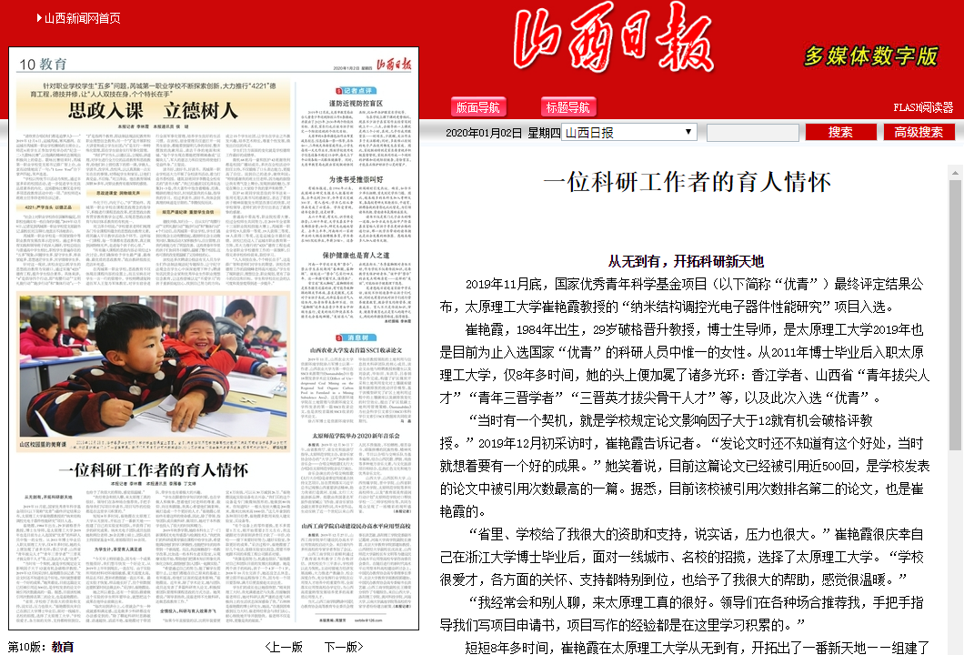 崔艳霞,1984年出生,29岁破格晋升教授,博士生导师,是国产亚洲精品美女久久久_99久无码中文字幕一本久道_亚洲成AV人影院_亚洲AV影院一区二区三区 狠狠躁夜夜躁人人爽天天不卡_国产激情久久久久影院老熟女_精品性高朝久久久久久久2019年也是目前为止入选国家“优青”的科研人员中惟一的女性。从2011年博士毕业后入职国产亚洲精品美女久久久_99久无码中文字幕一本久道_亚洲成AV人影院_亚洲AV影院一区二区三区 狠狠躁夜夜躁人人爽天天不卡_国产激情久久久久影院老熟女_精品性高朝久久久久久久,仅8年多时间,她的头上便加冕了诸多光环:香江学者、山西省“青年拔尖人才”“青年三晋学者”“三晋英才拔尖骨干人才”等,以及此次入选“优青”。